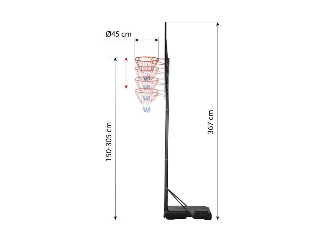 Díky možnosti nastavení výšky se koš dokonale přizpůsobí vašim potřebám. Ať už jste začátečník, nebo zkušený šampion, náš koš vám poskytne dokonalé nastavení pro maximální využití vašeho potenciálu. Změna výšky se provádí uchycením konzole na zadní straně desky do jedné ze 14-ti úrovní. Výšku obruče lze nastavit v rozsahu od 1,5 do 3,05 metru.