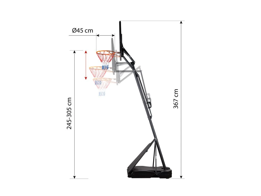 Díky možnosti nastavení výšky se koš dokonale přizpůsobí vašim potřebám. Ať už jste začátečník, nebo zkušený šampion, náš koš vám poskytne dokonalé nastavení pro maximální využití vašeho potenciálu. Změna výšky se provádí uchopením madla, stisknutím tlačítka a posuvem madla po regulační tyči, která je cejchovaná, abyste okamžitě věděli, v jaké výšce se aktuálně nachází obruč. Výšku obruče lze nastavit do 5-ti úrovní v rozsahu od 2,45 do 3,05 metru.