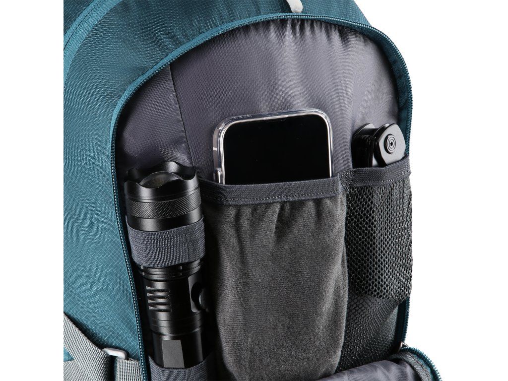 Hlavní komora na dvoucestný zip je opatřena kapsou na hydrovak, který lze zavěsit na řemínek se suchým zipem. Druhá, menší komora je také opatřena dvoucestným zipem a uvnitř se nachází 2 kapsy na drobnosti a 3 poutka například pro umístění svítilny. V horní části předního panelu se nachází menší kapsa, do které se přistupuje jednocestným zipem. Po stranách batohu jsou síťované kapsy s gumičkou v lemu, nad kapsami se nachází délkově nastavitelné popruhy s přezkou, pod které lze umístit například vyšší láhev. Z čela batohu se nachází 2 gumová poutka a 2 smyčky pro přenášení turistických holí, 4 poutka pro zavěšení například kempingového vybavení a poutko pro připevnění blikačky pro zvýšení viditelnosti za šera.
