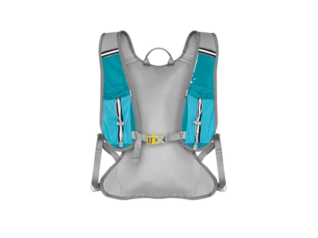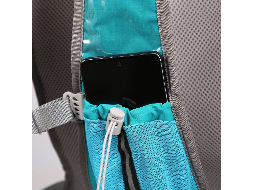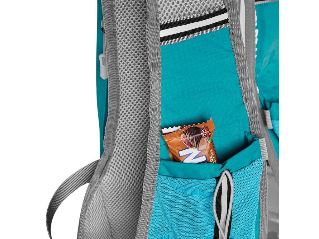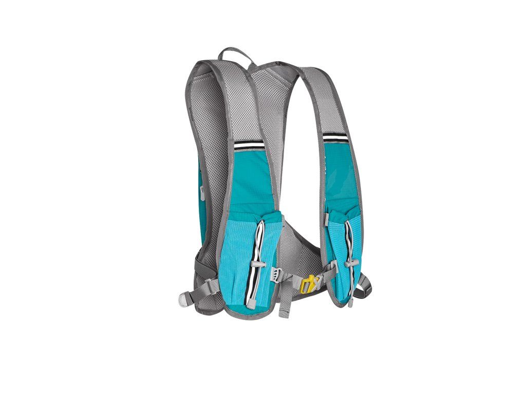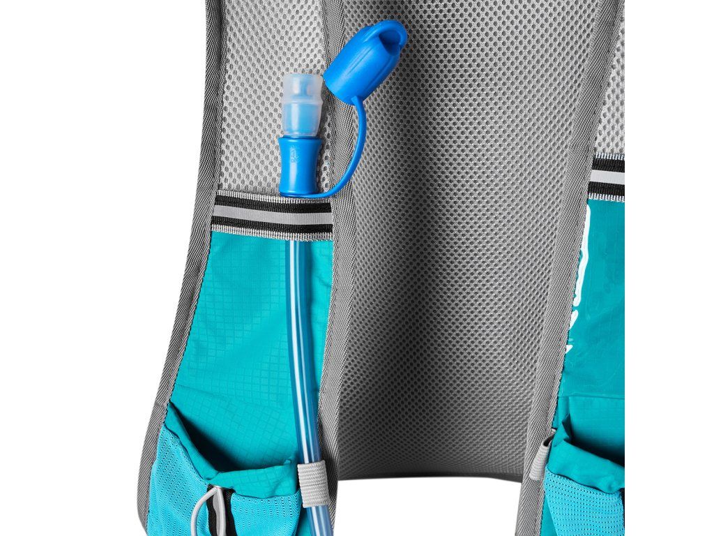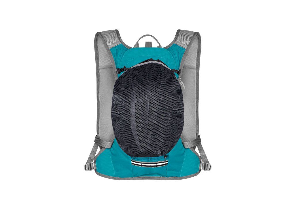 Hlavní komora batohu je opatřena přepážkou, v horní části se nachází 2 suché zipy pro zavěšení hydrovaku (není součástí dodávky). Zadní strana hlavní komory je opatřena hliníkovou fólií, která slouží jako izolace mezi hydrovakem a zády, takže nápoj se nebude ohřívat teplem od zad. Hadičku hydrovaku lze vyvést průvlaky na pravé i na levé straně pod ramenními panely. Přední strana batohu je opatřena gumovým lankem s brzdičkou, pod které lze uložit například karimatku. Níže nalezneme kapsu, ve které se skrývá síťka, kterou lze vytáhnout a pomocí karabinek připnout ke stranám batohu, síťka následně vytvoří kapsu, co které můžeme uložit například cyklistickou helmu, ešus apod.. Pod kapsou je reflexní panel, ke kterému si můžeme připnout další vybavení. Na pravé straně se skrývá další kapsa na zip, která je ideální pro telefon, peněženku, nebo například klíče. Na horní straně batohu je poutko pro snadné přenášení batohu v ruce. Záda a ramenní popruhy jsou vyrobeny ze síťoviny doplněné o prodyšnou pěnu, která zvyšuje prodyšnost panelu a záda se budou méně potit. Ramenní popruhy jsou opatřeny reflexními řemínky pro protažení hadičky od hydrovaku a kapsami ze síťoviny. Na levém popruhu se navíc nachází kapsička s průhlednou čelní stranou, do které lze uložit například kartičku pro případ ztráty, startovní číslo a podobně. Ramenní popruhy jsou spojeny hrudním pásem, který lze výškově nastavit. Popruh je spojen plastovou přezkou s píšťalkou.