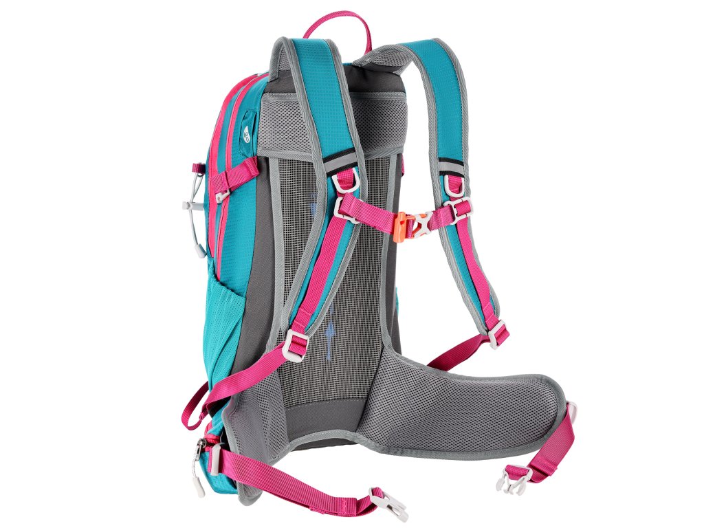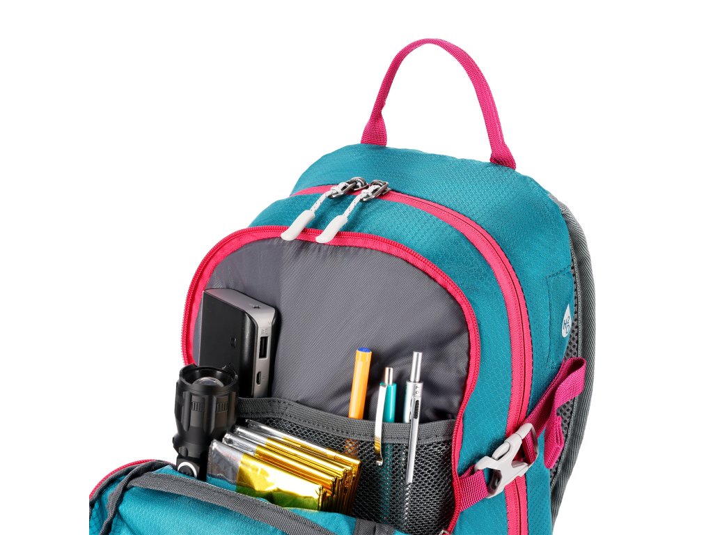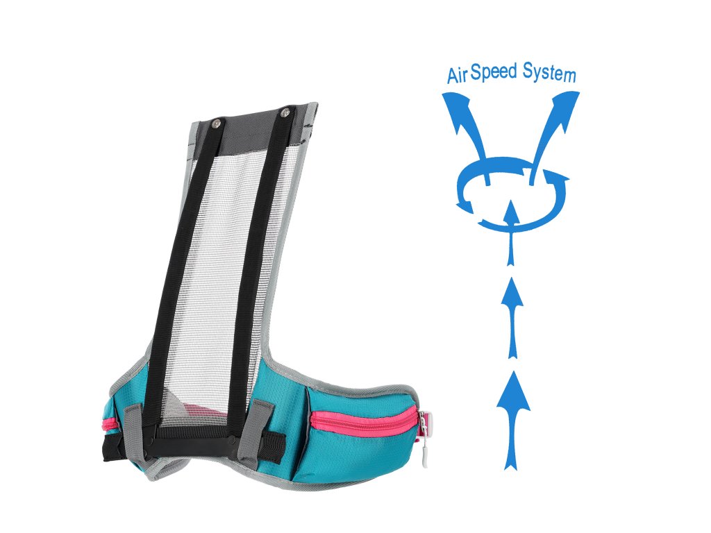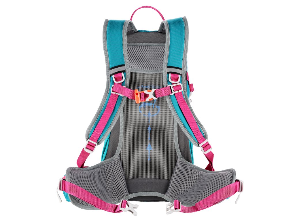 Na přezce hrudního popruhu je umístěna integrovaná záchranná píšťalka pro větší bezpečnost v nouzových situacích. Batoh dále nabízí další panel s úchyty na různé příslušenství, dvě boční síťované kapsy a kapsy na zip v bederním pásu, ideální pro uložení telefonu nebo jiných drobností.