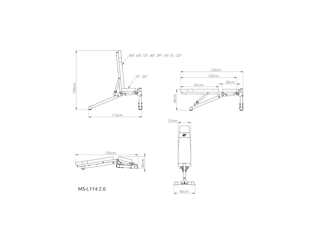 Sedák lze nastavit do 2 poloh a jeho regulace se provádí pomocí čepu. Lavici MS-L114 2.0 lze v kombinace se stojanem pod velkou činku použít také k silovému tréninku, nosnost lavice je 250 kilogramů. Polstrování je opatřeno dvojitými švy pro maximální pevnost. V nejnamáhanějším místě je zádová opěra opatřena druhou vrstvou syntetické kůže s logem MARBO Sport.