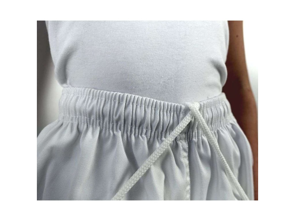 Lehký, a zároveň odolný materiál (směs polyesteru a bavlny, cca 200 g/m2) zajišťuje volnost pohybu a vynikající ventilaci, díky čemuž se vaše dítě může plně soustředit na trénink. Pohodlný střih, systém zesílení v rozkroku i na okrajích a dvojitý systém upevnění kalhot (guma + šňůrka) jsou zárukou, že oděv vydrží každý trénink a bude sloužit dlouhou dobu.