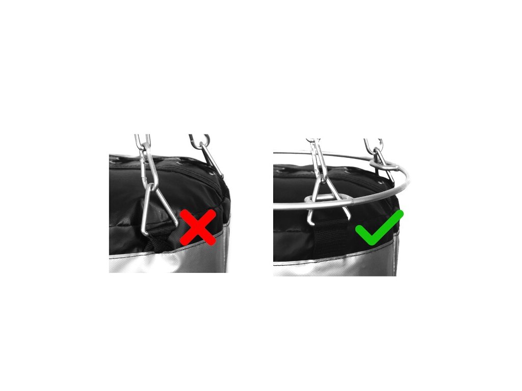 Při tréninku na pytli často dochází ke zkroucení nosných popruhů. Takové zkroucení vede k nerovnoměrnému rozložení hmotnosti pytle na popruhy, což může způsobit jejich rychlejší opotřebení nebo roztržení švů. Použití obruče zaručuje přirozené vyrovnání popruhů a zabraňuje jejich kroucení během tréninku.