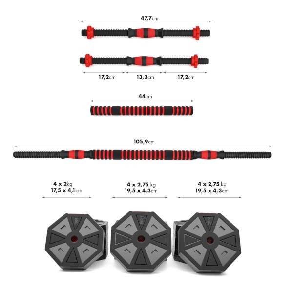 Sada obsahuje 1 spojovací díl, 2 jednoruční hřídele, 4 hvězdicové matice a celkem 12 kotoučů různých vah.