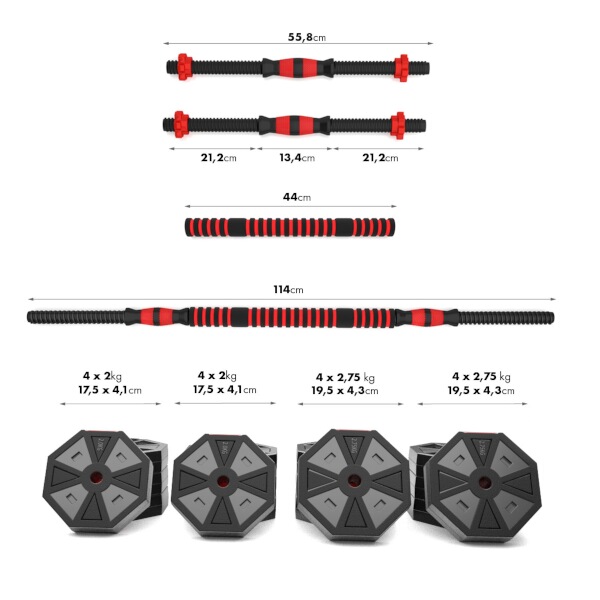 Sada obsahuje 1 spojovací díl, 2 jednoruční hřídele, 4 hvězdicové matice a celkem 16 kotoučů různých vah.