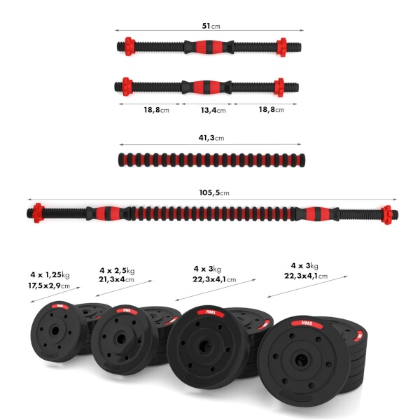 Kompletní nakládací sada dvou jednoručních a jedné obouruční činky o celkové hmotnosti 40 kilogramů, to je HMS SGP40. Kotouče jsou vyrobeny z tvrdého plastu, který je vyplněn cementem. Obouruční osa je spojovacím dílem, do kterého se všroubují hřídele jednoručních činek. Nakládací trny jsou opatřeny závitem a závaží se zajišťuje pomocí hvězdicových matic. Nakládací činky patří ke klasickému vybavení každé domácí posilovny.