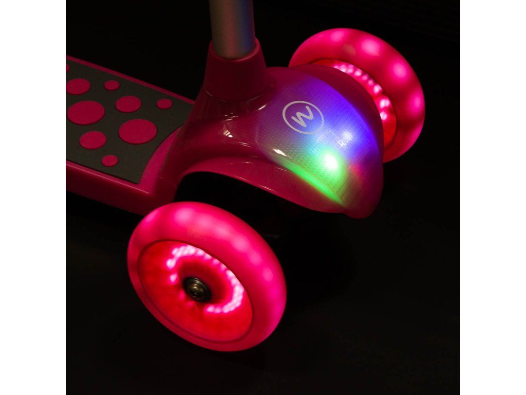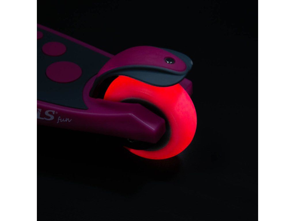 Koloběžka NILS Fun HLB02 má kolečka osazena svítícími LED diodami, které slouží jako zajímavý, vizuální prvek, zvyšují zájem dětí a v neposlední řadě zvyšují viditelnost koloběžky například za šera. Kolečka svítí automaticky během jejich otáčení.