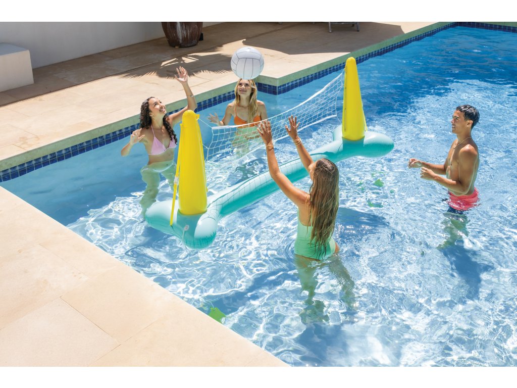 Nafukovací volejbal do bazénu S touto nafukovací volejbalovou sadou můžete zažít velké zápasy plné napětí a zábavy. Sestavte s kamarády nebo v rodině více mužstev a uspořádejte velký volejbalový turnaj. Součástí sady je i nafukovací míč a opravná sada. Výrobky značky splňují nejpřísnější bezpečnostní normy na zpracování a použité materiály. Součástí balení taška a nafukovací míč.