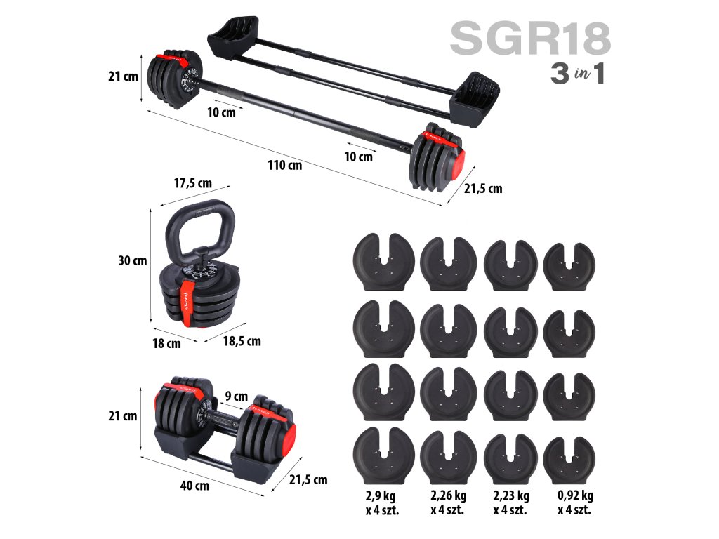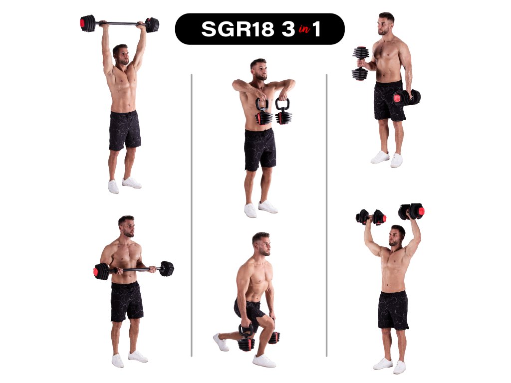 Činka SGR18 má ergonomický tvar a protiskluzovou rukojeť, která zajišťuje pohodlí a stabilitu. Činku lze sestavit jako jednoruční činku, obouruční činku, nebo jako kettlebell. Pro tento účel naleznete v balení prodlužovací díl (obouruční úchop) o délce 80 centimetrů, který lze zaměnit za jednoruční úchop a 2 tyče pro rozšížení základny. Dále jsou v balení 2 madla pro použití závaží jako kettlebell.