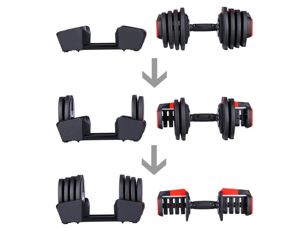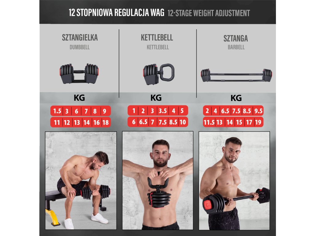 Trénink s jednoruční činkou umožňuje větší volnost pohybu a lepší stabilizaci těla. Cviky můžete provádět v různých rovinách a směrech, což zapojuje více svalů a zlepšuje koordinaci. S činkou můžete procvičovat různé části těla, například hrudník, záda, ramena, paže, břicho, nohy nebo hýždě. Nepotřebujete více činek s různou hmotností, stačí vám jedna, kterou můžete přizpůsobit své úrovni a účelu. V této variantě lze nastavit hmotnost činky na 1,5 - 3 - 6 - 7 - 8 - 9 - 11 - 12 - 13 - 14 - 16 nebo 18 kg. Tyto činky jsou v balení 2.
