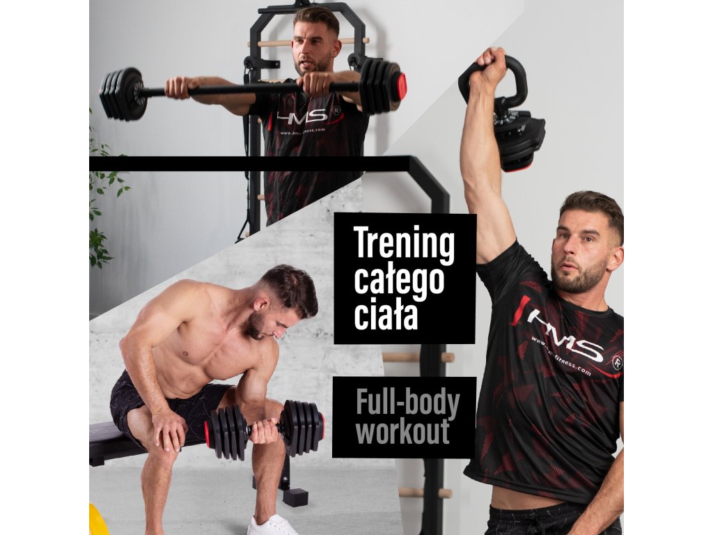 HMS SGR18 PRO SET 3v1 je sada variabilní - nastavitelné činky s možností sestavení jako jednoruční činka, obouruční činka, nebo kettlebell.
