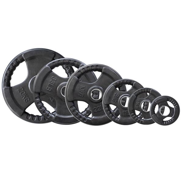Olympijský, pogumovaný kotouč HMS Tri-grip je známkou kvality a precizního provedení. Tento talíř má otvor o průměru 50 mm, je tedy vhodný pro všechny typy olympijských os. Závaží disponuje třemi držadly pro snadnou manipulaci a pogumovaný povrch prodlužuje jeho životnost.