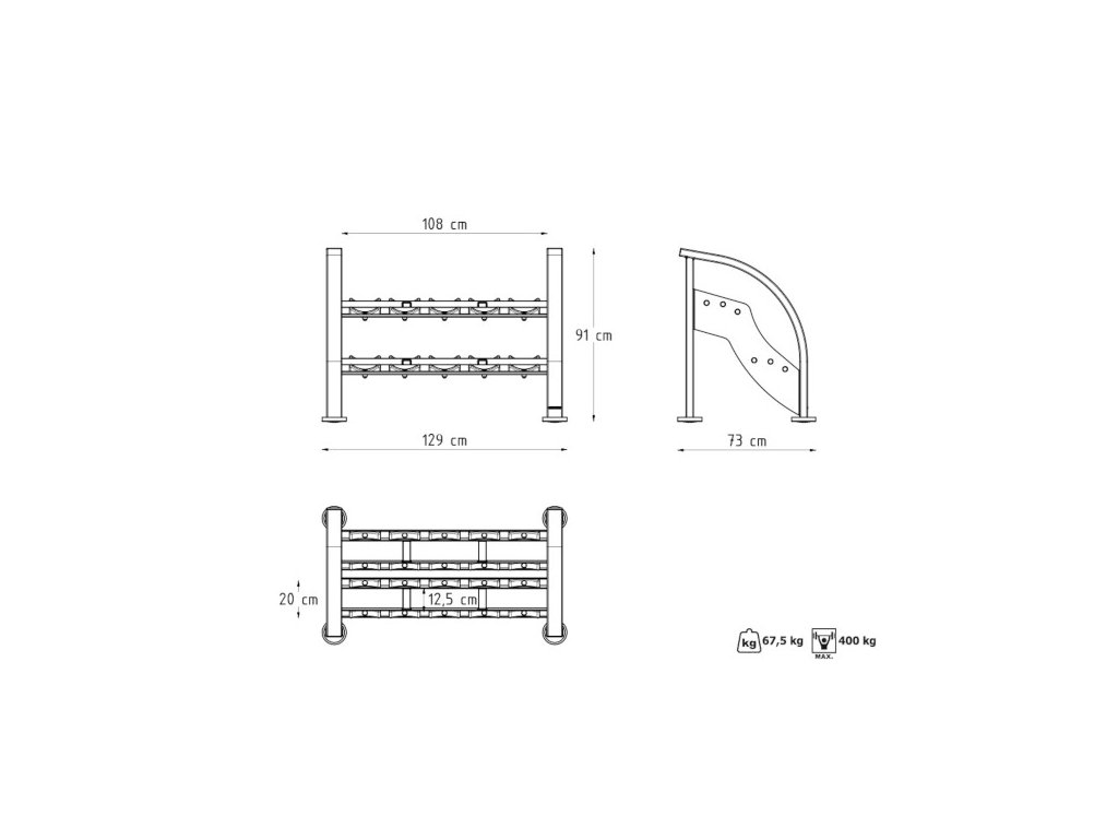 Profesionální stojan na činky MARBO MF-S002 je jedním ze základních prvků každé posilovny, který šetří místo, pomáha udržovat pořádek a zlepšuje přehlednost Vašich činek. Stojan je modulární - lze je dodat po jednotlivých kusech (129 cm), které je možno spojit do libovolné délky. Konstrukci stojanu tvoří ocelové profily 100 x 50 a 100 x 40 mm, to zaručuje maximální nosnost 400 kg na modul. MF-S002 má 2 police, ty jsou opatřeny ogumováním na které uložíte 5 párů činek s minimální délkou úchopu 125 mm a maximálním průměrem 210 mm.