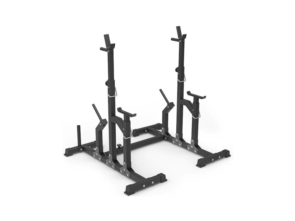 Regulace šířky a výšky stojanů se provádí pomocí šroubu s ergonomickou hlavou. Pro maximální bezpečnost se poloha navíc zajišťuje bezpečnostním kolíkem. Regulace výšky zarážek se provádí pouze bezpečnostním kolíkem. Madla na stojanech slouží k pohodlné změně výšky a zároveň jsou navrhnuty jako podpěry k tréninku dipů. Konstrukce je opatřena dvěma trny pro odložení nepoužívaných závaží, ty zároveň slouží ke zvýšení stability stojanu.