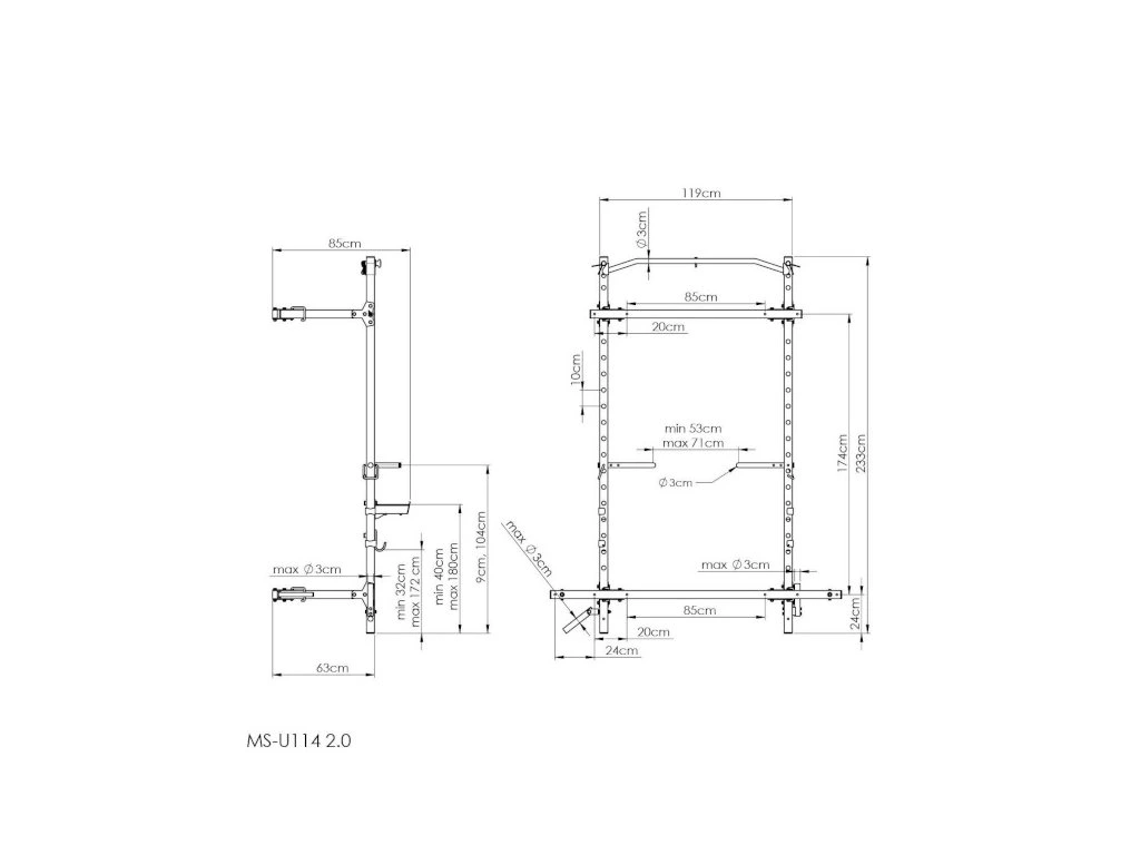 Po skončení tréninku lze tréninkovou klec MS-U114 2.0 rychle a pohodlně složit, abyste zmenšili prostor, který zabírá, což bude nepochybně výhodou pro ty, kteří mají omezený tréninkový prostor. Hlouba po složení je pouhých 25 centimetrů. Pro složení je potřeba demontovat hrazdu a vyjmou 4 bezpečnostní čepy - v každém kloubu jeden.