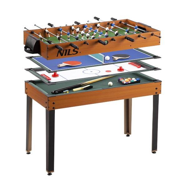 Multifunkční herní stůl NILS SDM 4v1, který obsahuje nejoblíbenější hry jako je - fotbálek, billiard, air hokej a stolní tenis. To vše na jednom místě s jednoduchou výměnou herní desky.