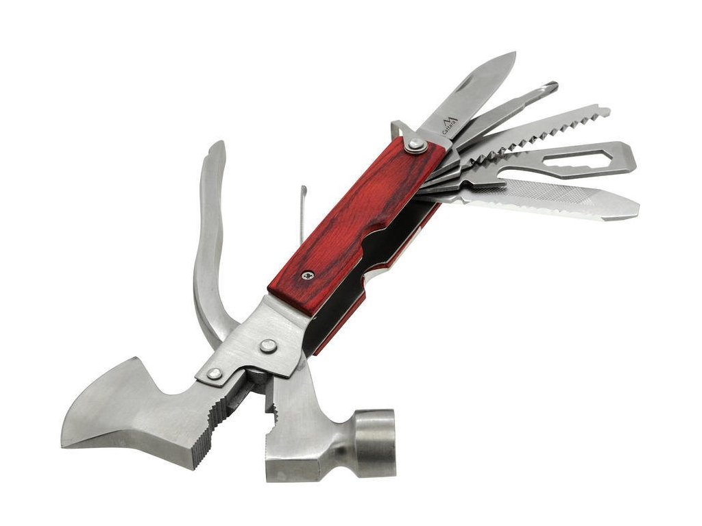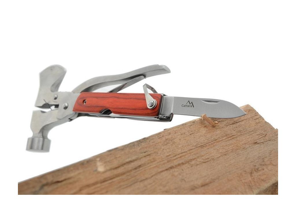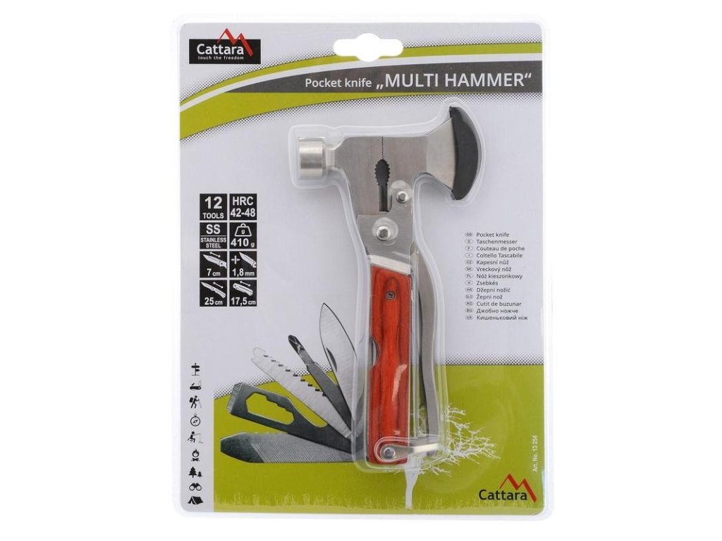 Potřebujete narychlo uříznout kousek dřeva, zatlouct hřebík nebo si jen otevřít plechovku s osvěžujícím nápojem? Multifunkční nůž Cattara Multi Hammer vám s těmito aktivitami pomůže. Vejde se vám do kapsy nebo ho přichytíte pomocí textilního pouzdra za opasek. V nožíku se skrývá celkem 12 nástrojů, které máte neustále při sobě, ať už jste doma, na rybách nebo kempujete v přírodě.
