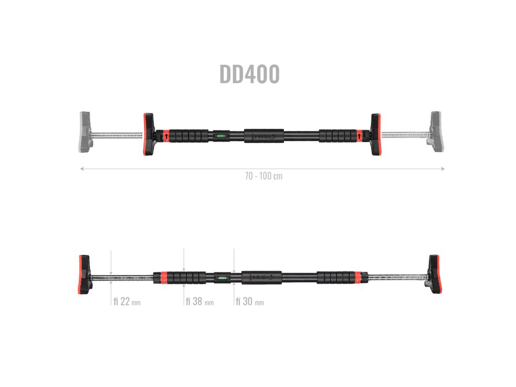 Po vytažení hrazdy z balení se na její konce nasadí koncovky. Hrazdu si na zemi roztáhneme tak, aby byla o několik centimetrů kratší, než je šířka zárubní a dotažením černých matic zajistíme délku hrazdy. DD400 vložíme do zárubní, pomocí dodávané vodováhy ji vyrovnáme a dotáhneme černé matice. Jakmile hrazda drží, tak si z koncovek vytáhneme klíč, který si prodloužíme pomocí nástavce a následně dotáhneme černé matice tak, aby hrazda pevně držela. Nástavec a vodováhu si uschováme pro další použití, klíče nacvakneme zpět do koncovek a můžeme začít s tréninkem.
