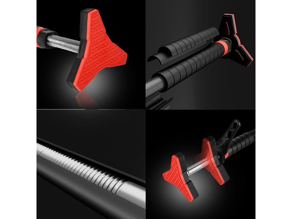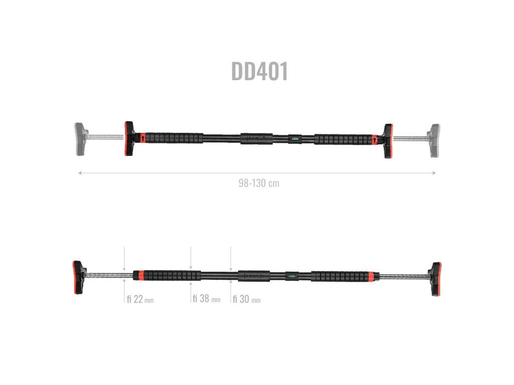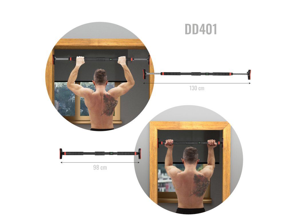 Po vytažení hrazdy z balení se na její konce nasadí koncovky. Hrazdu si na zemi roztáhneme tak, aby byla o několik centimetrů kratší, než je šířka zárubní a dotažením černých matic zajistíme délku hrazdy. DD401 vložíme do zárubní, pomocí dodávané vodováhy ji vyrovnáme a dotáhneme černé matice. Jakmile hrazda drží, tak si z koncovek vytáhneme klíč, který si prodloužíme pomocí nástavce a následně dotáhneme černé matice tak, aby hrazda pevně držela. Nástavec a vodováhu si uschováme pro další použití, klíče nacvakneme zpět do koncovek a můžeme začít s tréninkem.