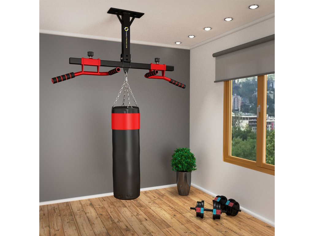 Součástí hrazdy je držák na boxovací pytel, takže jeden produkt poslouží ke dvěma typům tréninku.