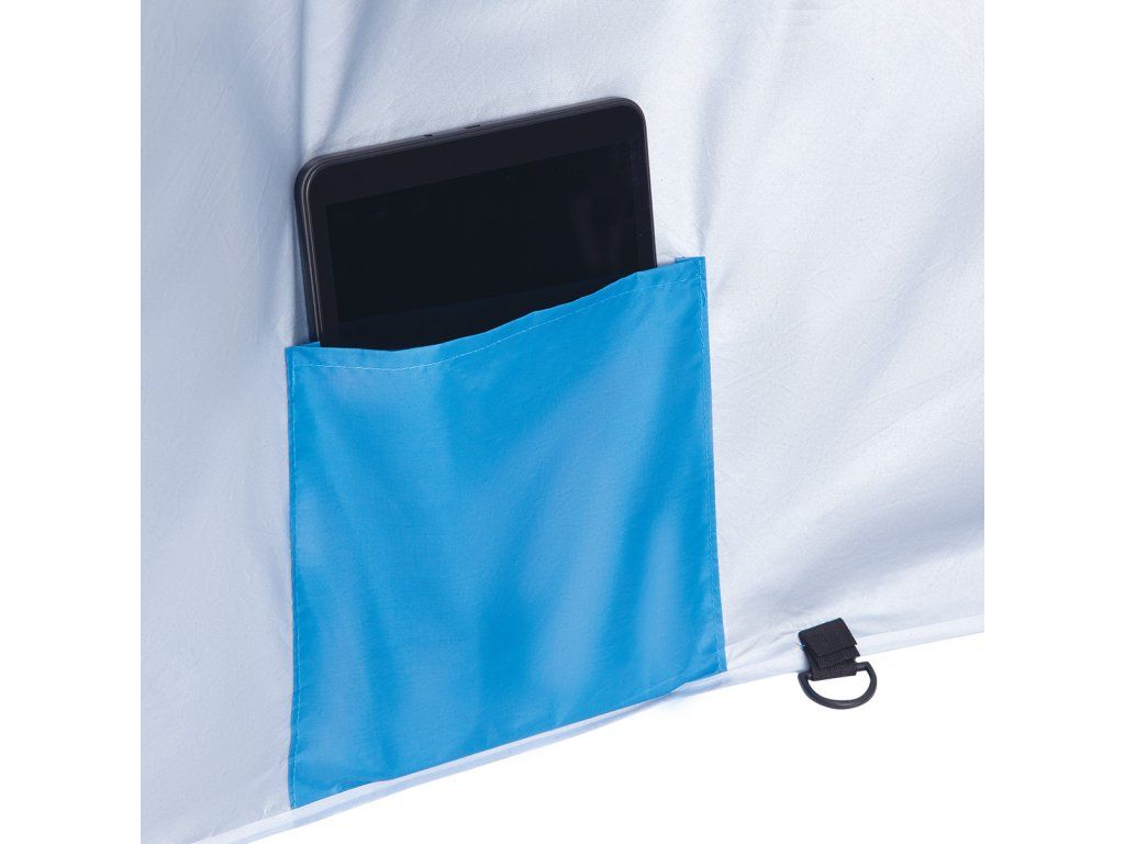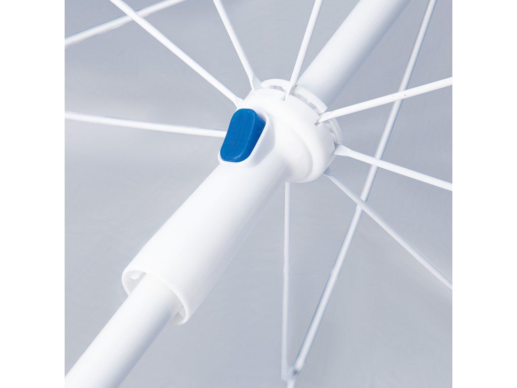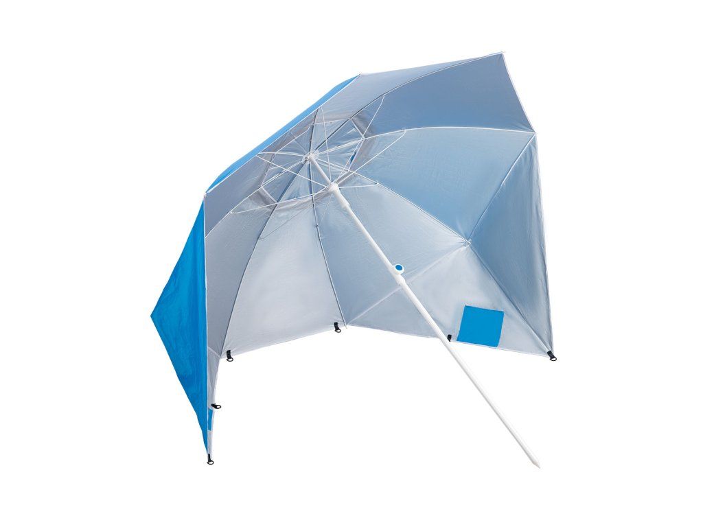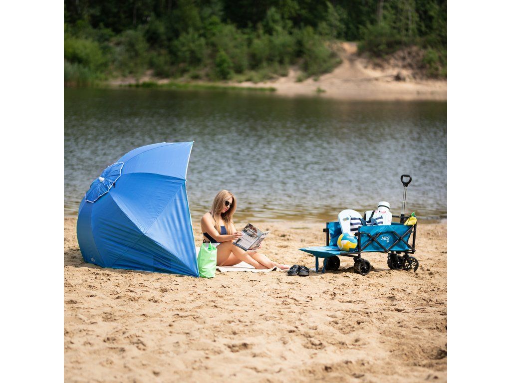 Plážový slunečník s možností použití jako plážová zástěna, to je NILS Camp NC7822. Slunečník je ideálním parťákem během slunečného odpoledne na pláži a nebo na zahradě. NC7822 se snadno přenáší díky dodávanému vaku s poutkem přes rameno. Spodní tyč je osazena špičkou pro snadné zapíchnutí do podkladu. Polyesterová plachta má průměr 190 centimetrů a dokonale chrání před slunečním svitem a škodlivým UV zařením. Na 2 protilehlých stranách se nachází bočnice o šířce 75 centimetrů, které se použijí při položení slunečníku na podklad a slouží jako okraje plážové zástěny, ta se zajistí k podkladu pomocí 4 dodávaných kolíků. Pokud NC7822 používáme jako slunečník, můžeme bočnice pomocí plastových karabinek připnout k vrchlíku, aby nám nepřekážely.