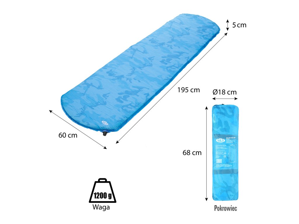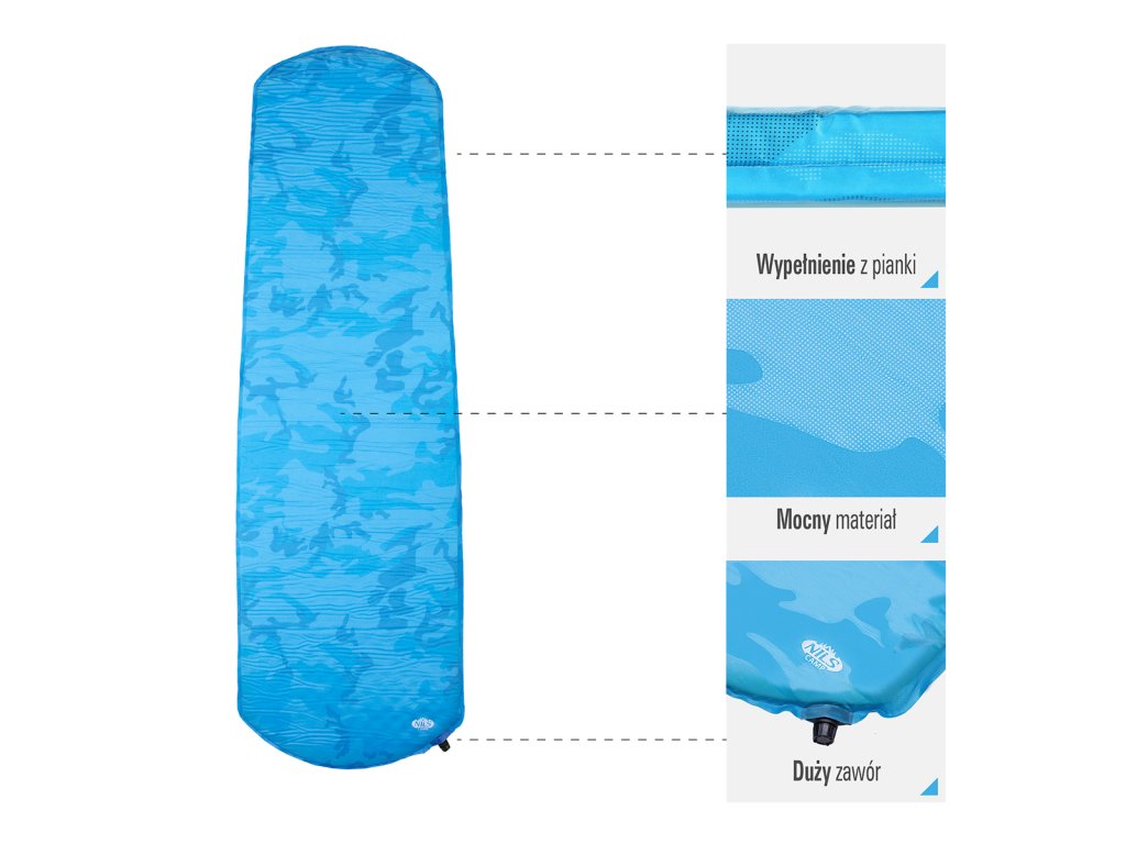 Samonafukovací karimatka NILS CAMP NC4062 zajistí kvalitní spánek během kempování a dovolených pod stanem. Podložka je ale vhodná i k vodě a všude tam, kde si chcete příjemně poležet. Samonafouknutí zajišťuje vnitřní, pěnový materiál s otevřenými póry. Po povolení ventilu do sebe nasává vzduch a dostává se tak do původního stavu. Závěrem je ještě potřeba podložku dofouknout na požadovanou tvrdost. Skládání se provádí otevřením ventilu a srolováním od opačné strany, než je ventil. Karimatku poté zajistíte řemínky a vložíte do dodávaného vaku. Na model NC4062 byl použit velice odolný polyester 190T potažený vrstvou PVC, tato kombinace zajišťuje vysokou odolnost a karimatka se dá položit i na nerovný povrch.