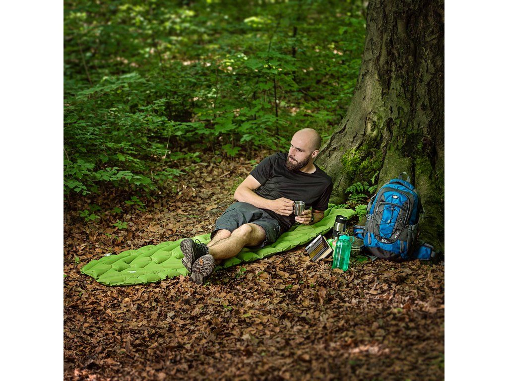 Ve složeném stavu zabírá podložka velmi málo místa a její skládání je velmi jednoduché. Stačí odšroubovat ventil a karimatku srolovat od horního okraje. Nemusíte se bát, že se sama rozbalí, protože má popruh, který podložku po srolování zajistí. V sadě je navíc praktické pouzdro, do kterého můžeme karimatku zabalit. Usnadní vám přepravu a navíc chrání podložku před poškozením. Díky své velikosti a hmotnosti jen 0,6 kg ji můžete mít snadno u sebe na každé cestě.