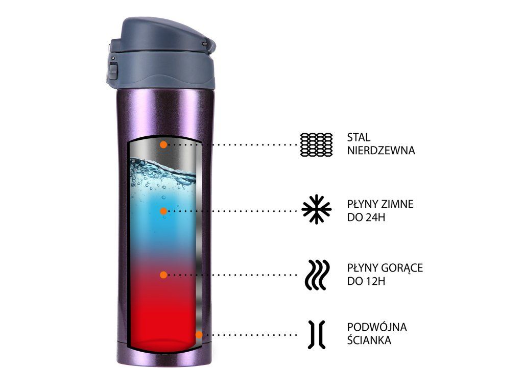 Termoska je vyrobena z nerezové oceli s dvojitou stěnou, která zaručuje uchování teplých nápojů po dobu 12 hodin a studených po dobu 24 hodin, nezáleží tedy, zda si do termosky připravíte ranní kávu, kterou vypijete v kanceláři a nebo zda si do ní přelijete oblíbenou limonádu a vezmete si ji s sebou na několikahodinovou procházku do přírody, termoska udrží Váš nápoj ve správné teplotě.