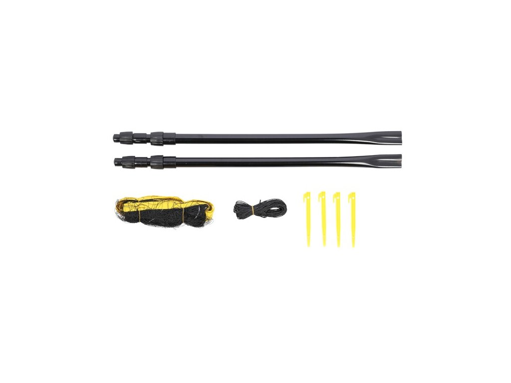 Sada se skládá ze 2 teleskopických sloupků, sítě o rozměrech 6,3 x 0,6 metru a 2 napínacích šňur. Všechno je zabaleno v praktickém obalu s uchem pro přenášení.
