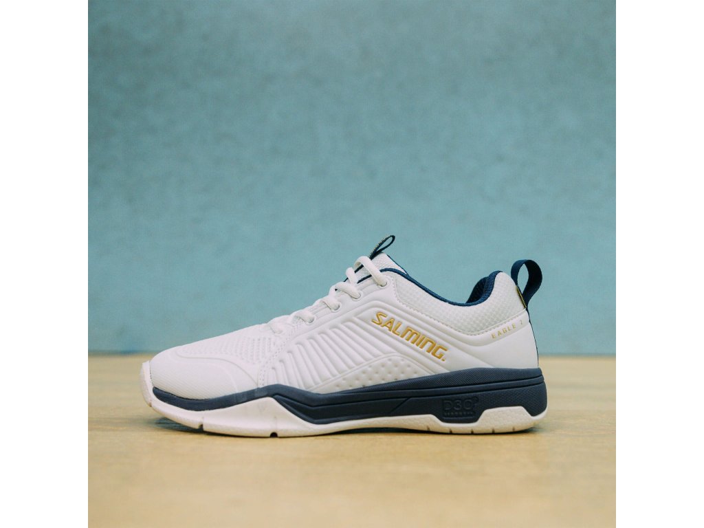 Svršek modelu Salming Eagle 2 tvoří dvouvrstvá konstrukce. První vrstvu tvoří funkční úplet, který obstarává pohodlí a zároveň zajišťuje skvělou prodyšnost. Druhá z vrstev je kombinovaná a ze dvou třetin ji tvoří ideálně pevná vrstva PU kůže, která má za úkol především stabilizaci chodidla v botě. Na tu se plynule v přední části napojuje vrstva z pružného materiálu KPU, který zejména ve špičce navyšuje odolnost tohoto sálového modelu.