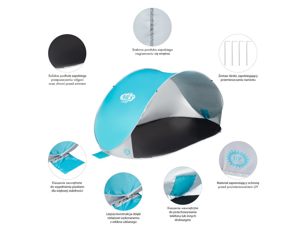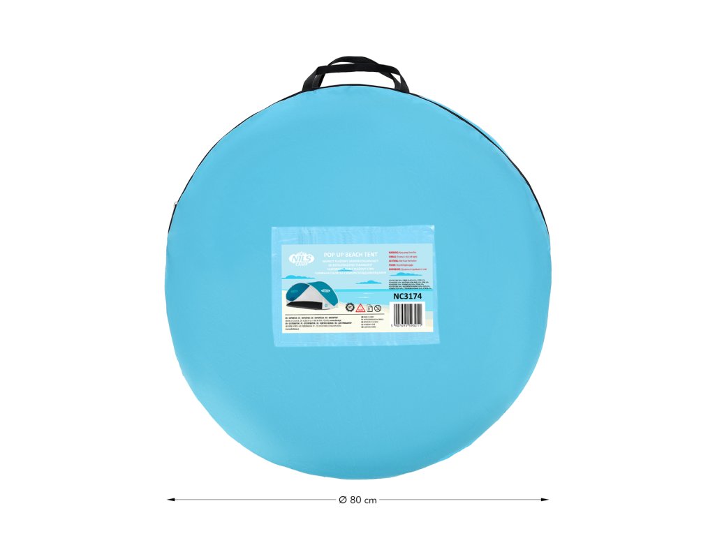Plážový stan NILS Camp NC3174 využijete nejen během dovolené u moře, ale také na veřejném koupališti, nebo u bazénu na zahradě. Hlavní funkcí plážového stanu je ochrana před slunečními paprsky a škodlivým UV zářením. Model NC3174 odrazí až 96% UV záření. Stan je dodáván složený v kruhové tašce opatřené uchem pro snadné přenášení. Po vytažení z tašky se stan automaticky rozloží. Pro složení se použije jednoduché gesto a stan se schová opět do tašky. Podlaha o rozměrech 120 x 220 cm a výška 100 cm umožňují úkryt před sluncem jak dětem, tak rodičům. Podpůrná konstrukce přístřešku je tvořena sklo-laminátovou tyčí. Na ni je navlečena polyesterová plachta. Použitý materiál odolá i malé, dešťové přeháňce.