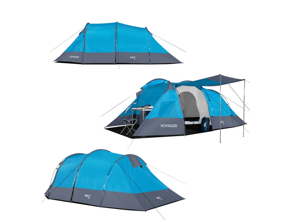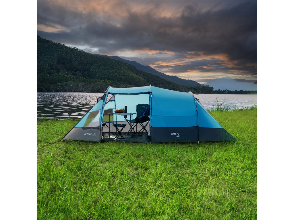 NILS Camp NC3027 Voyager je 4 osobový, kempingový stan tunelové konstrukce, který oceníte během teplých letních nocí při pobytu v kempu, nebo na zahradě. Stan Voyager je dvouplášťový a skládá se z prostorné předsíňky s podlážkou a jedné ložnice.