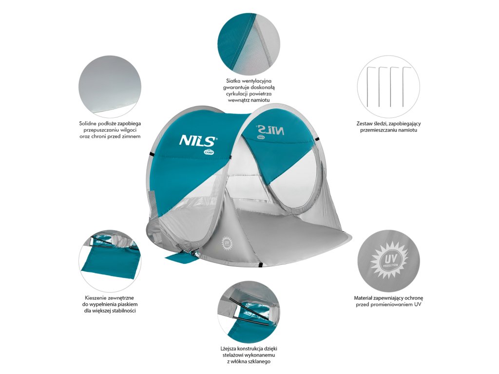 Plážový stan NILS Camp NC3142 využijete nejen během dovolené u moře, ale také na veřejném koupališti, nebo u bazénu na zahradě. Stan NC3142 se okamžitě rozloží, je odolný a funkční, ale především poskytne účinnou ochranu před slunečními paprsky, poskytne stín a zároveň úkryt před větrem.