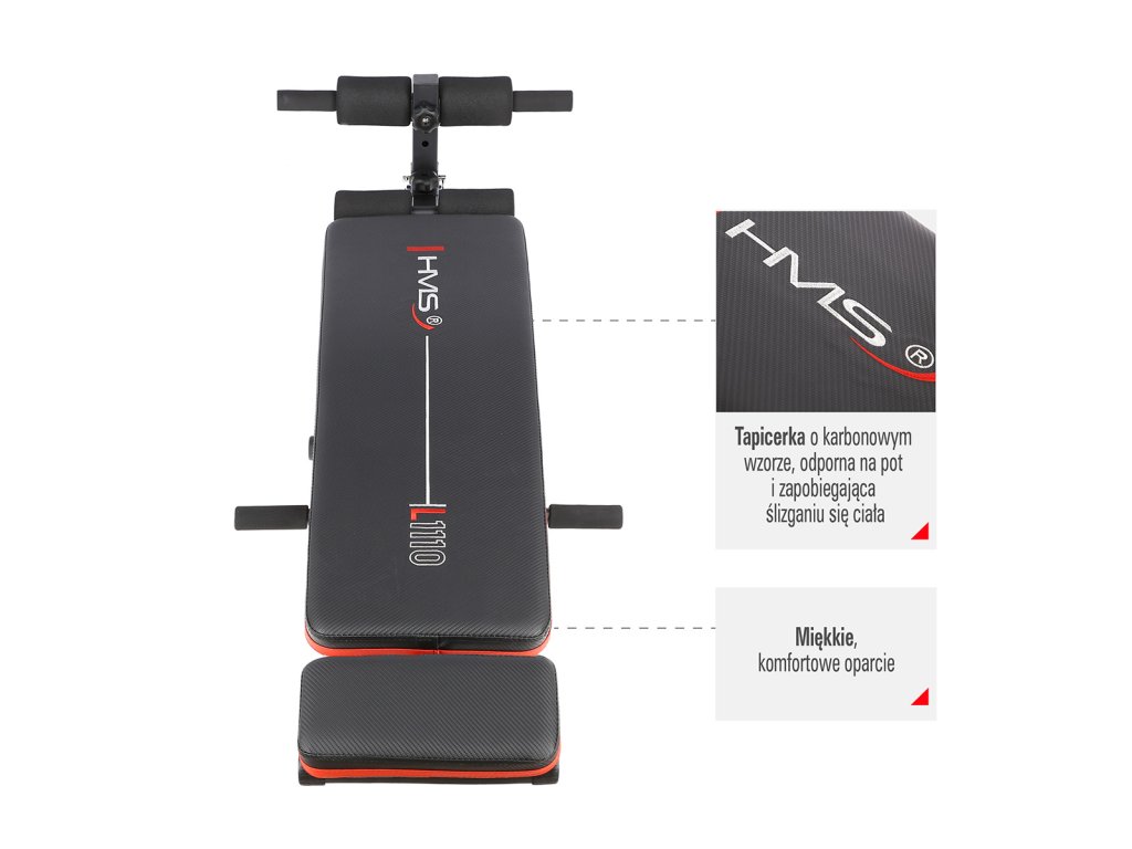 Lavice HMS L1110 je nejen stabilní, ale také pohodlná. Měkká pěna na opěradle a pěnové válce zajišťují pohodlí po celou dobu tréninku. Čalounění s karbonovým vzorem je nejen stylové, ale také odolné proti potu a zabraňuje klouzání těla během cvičení. Nastavitelný sklon umožňuje snadno upravit obtížnost cvičení podle vašich potřeb. Čím vyšší je sklon, tím pokročilejší je cvičení.