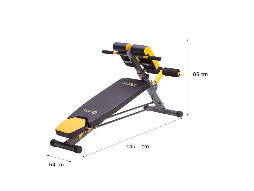 Zádová opěra je nastavitelná do 3 poloh, ve vodorovné poloze lze na lavici provádět většinu cviků s činkami, pokud se opěra nastaví do negativního úhlu, pak získáme šikmou lavici k posilování břicha.