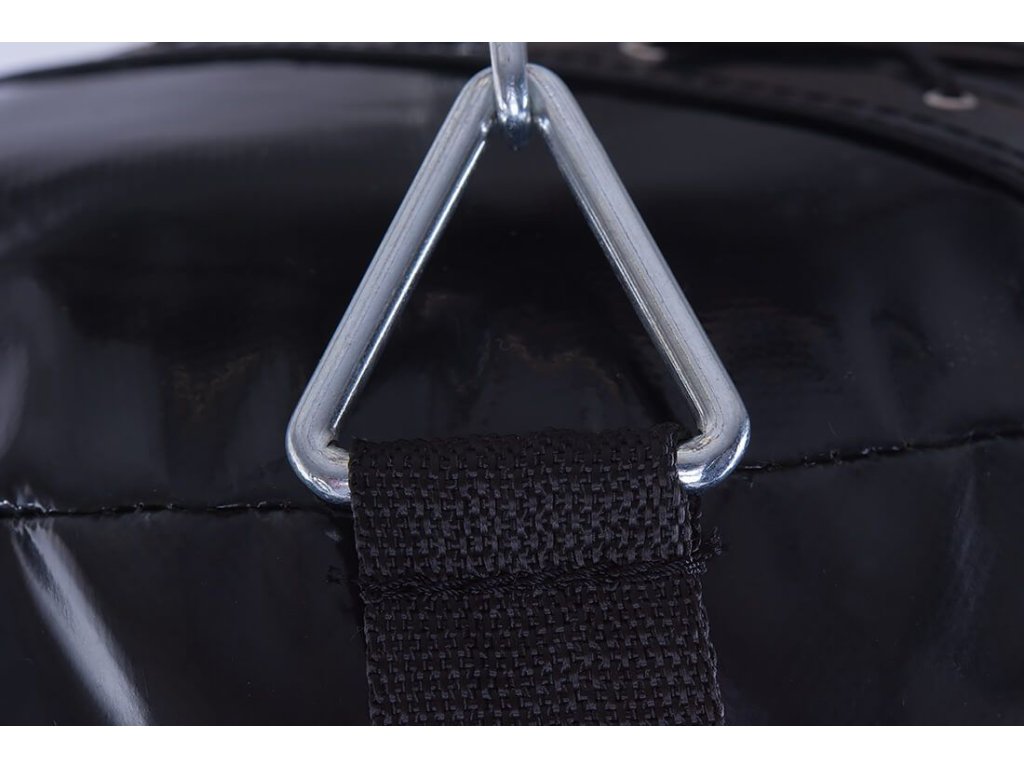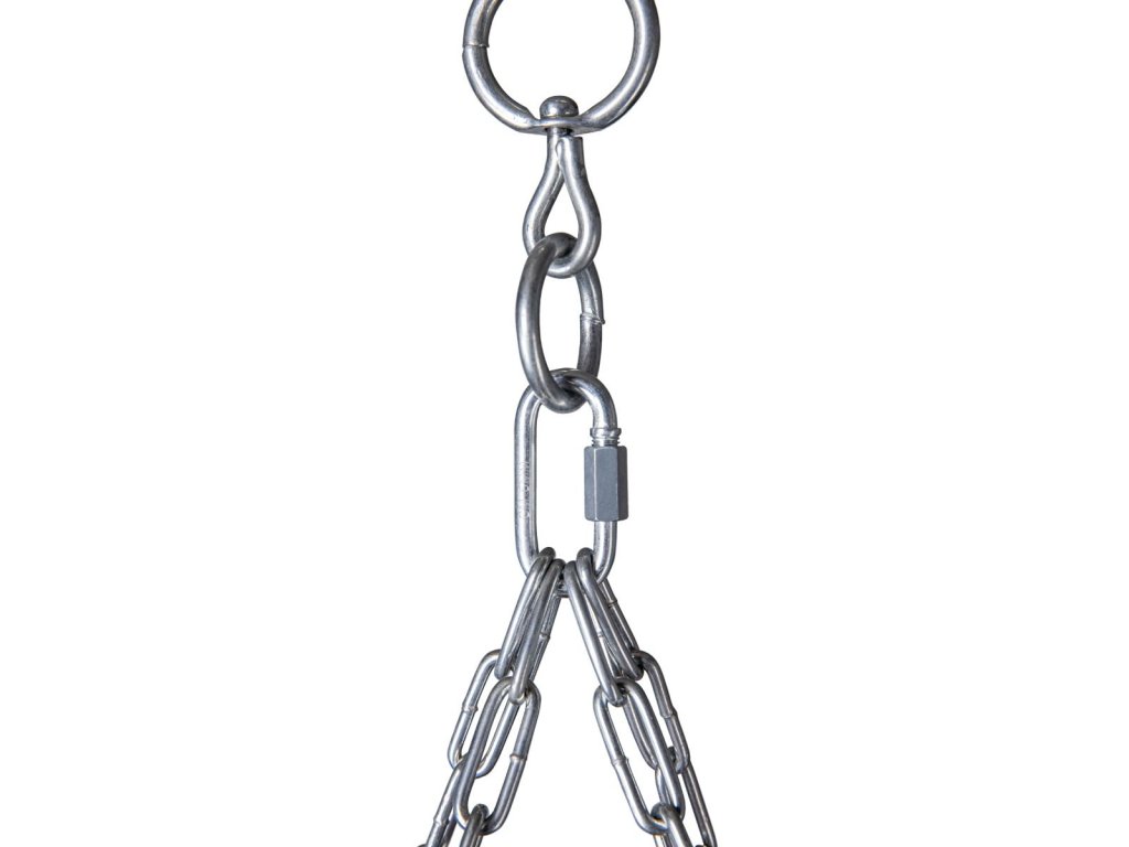 Řetězy: pytel je zavěšený na 4 mimořádně odolných svařovaných ocelových řetězech s otočnou vrchní částí, čímž je zabráněno zaplétání řetězů do sebe. Délka řetězů je samozřejmě lehce nastavitelná s použitím karabiny, která je součástí řetězů.