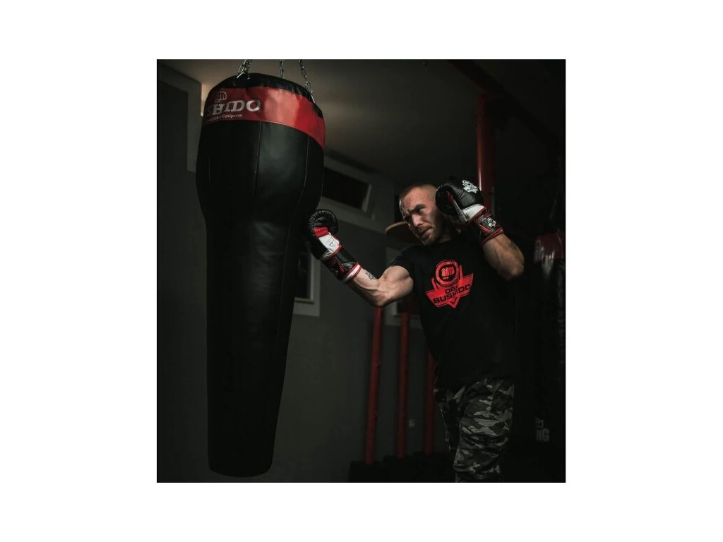 Profesionální boxovací hákový pytel DBX BUSHIDO 140 x 45 až 30 cm. Délka řetezů při zavěšení 45 cm (díky karabině lze nastavit i kratší délku).