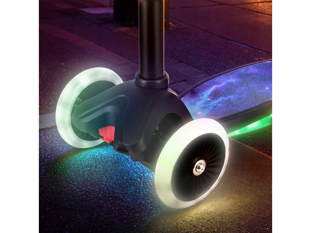 Bezpečnost a pohodlí při jízdě jsou prioritou, proto je koloběžka HLB1310 vybavena protiskluzovou platformou o rozměrech 40 x 13,5 cm. Ta poskytuje dětským nohám větší přilnavost, což zvyšuje stabilitu a kontrolu nad koloběžkou. Světelný efekt navíc dodává koloběžce moderní, atraktivní vzhled, který osloví i nejmladší uživatele. LED panely v platformě jsou napájeny 3 bateriemi AAA (LR03), které je potřeba zakoupit samostatně.