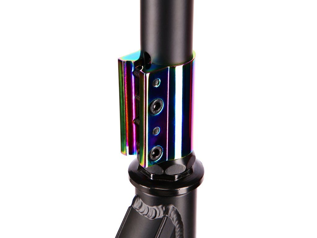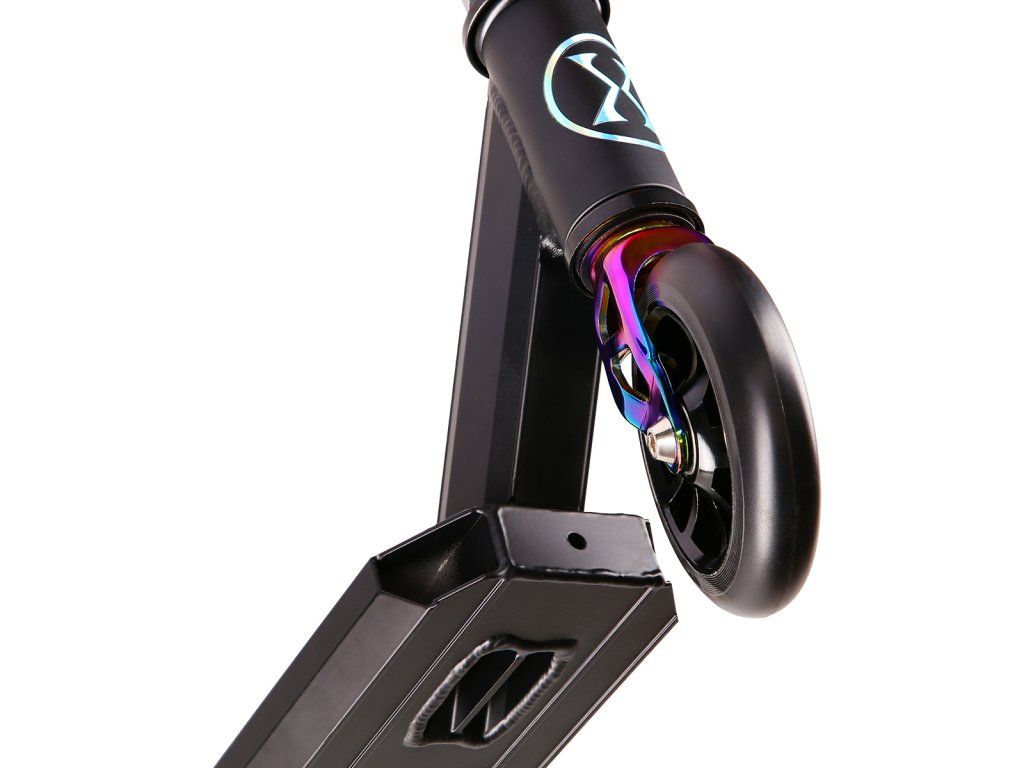Freestylová koloběžka nemá žádný skládací mechanismus ani systém nastavení výšky řídítek - tyto typy řešení by mohly oslabit celou konstrukci, což samozřejmě není žádoucí u produktu, kde je odolnost zásadní.