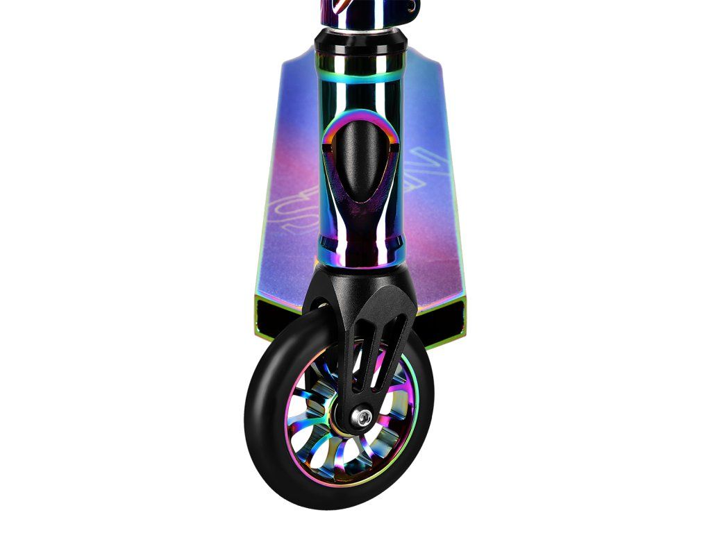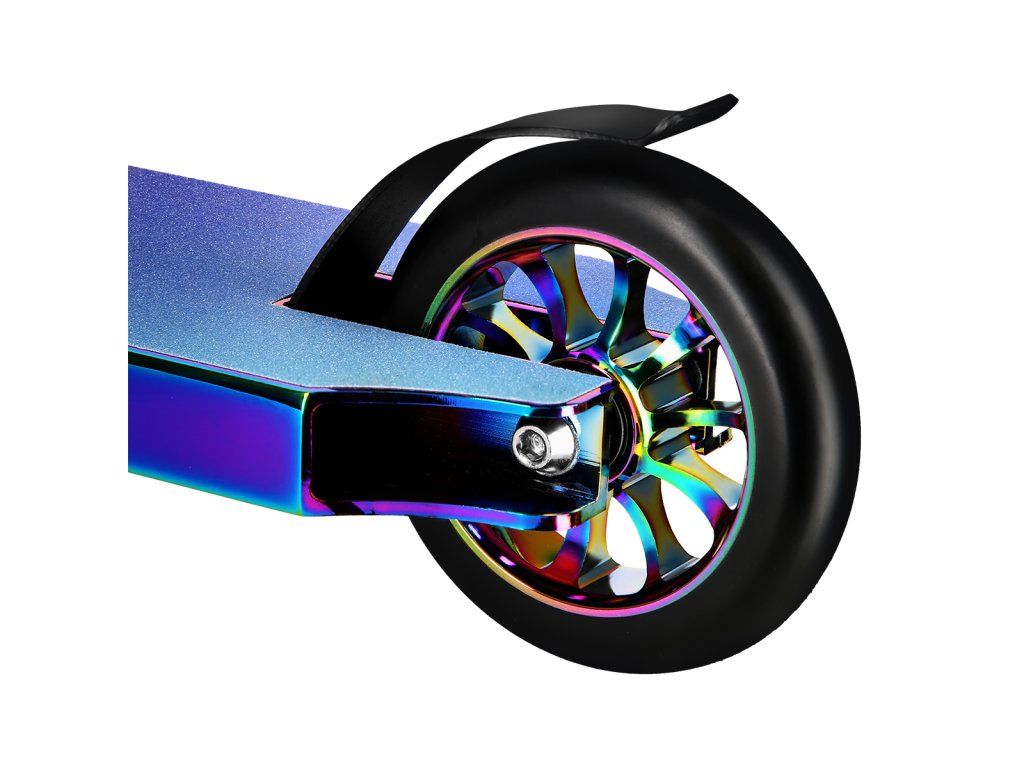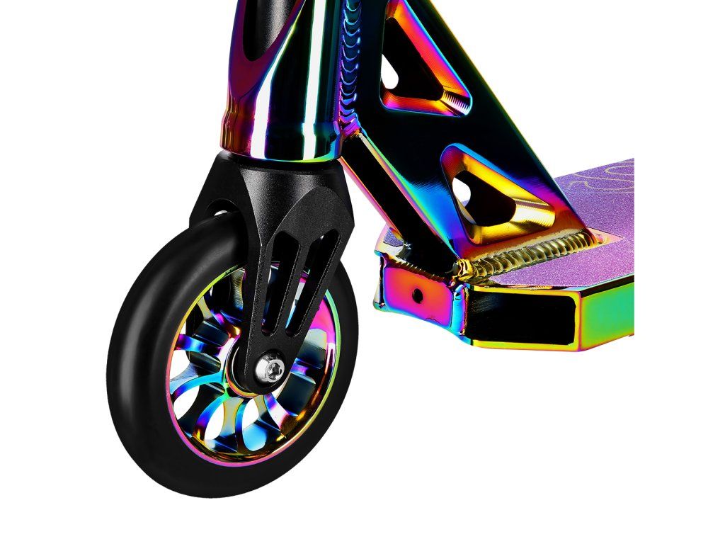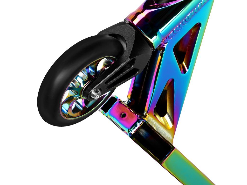 Freestylová koloběžka nemá žádný skládací mechanismus ani systém nastavení výšky řídítek - tyto typy řešení by mohly oslabit celou konstrukci, což samozřejmě není žádoucí u produktu, kde je odolnost zásadní. Při provádění triků se konstrukce setkává s velmi vysokým zatížením. Díky použití pevné oceli a silného hliníku je téměř nemožné koloběžku HS014 PRO dostat na limit a tak můžete i složité a náročné triky provádět s maximální jistotou.