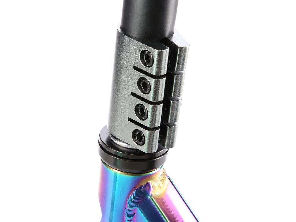 Řídítka jsou k ocelové, bezzávitové vidlici připevněny pomocí 4-šroubové svorky, lze je tak snadno vyměnit. Robustní deck má dvě příčky a tři komory. Gumové gripy pohlcují nežádoucí vibrace.