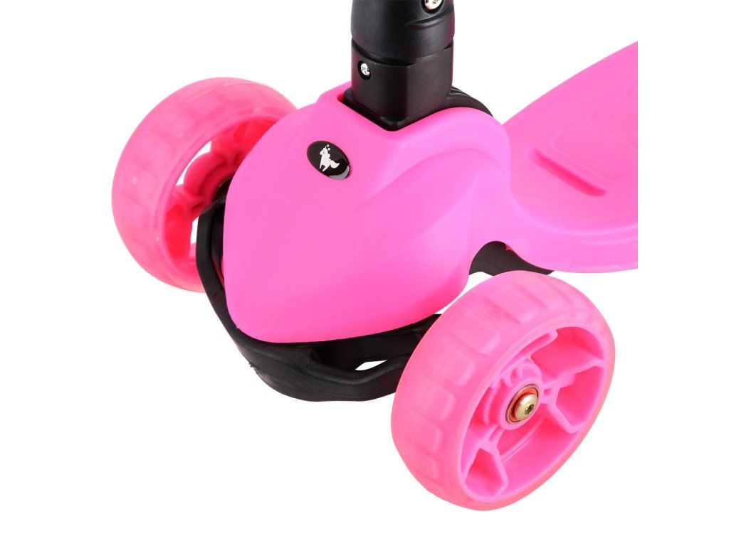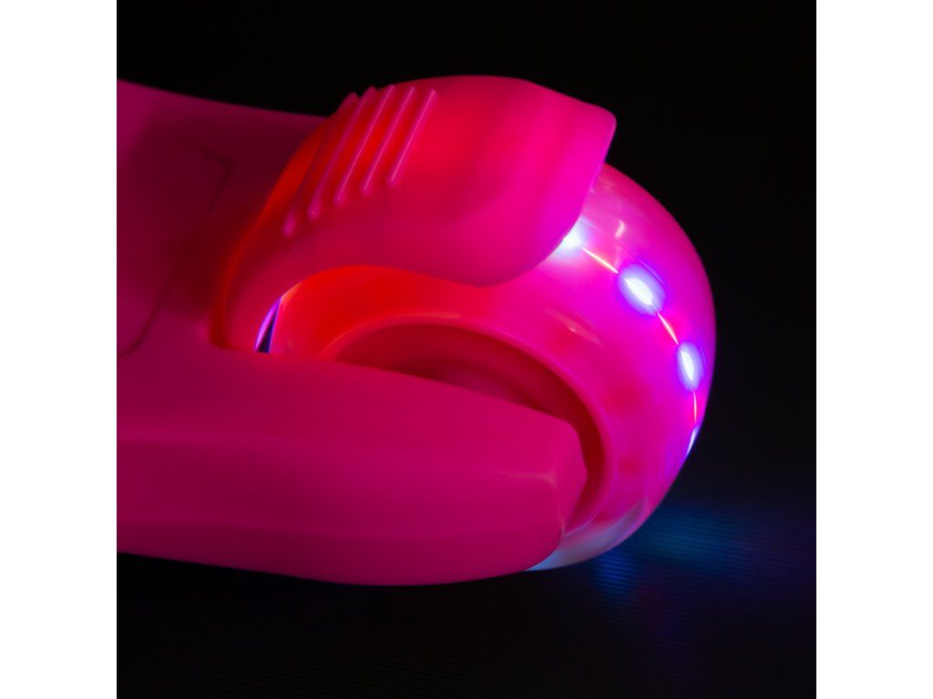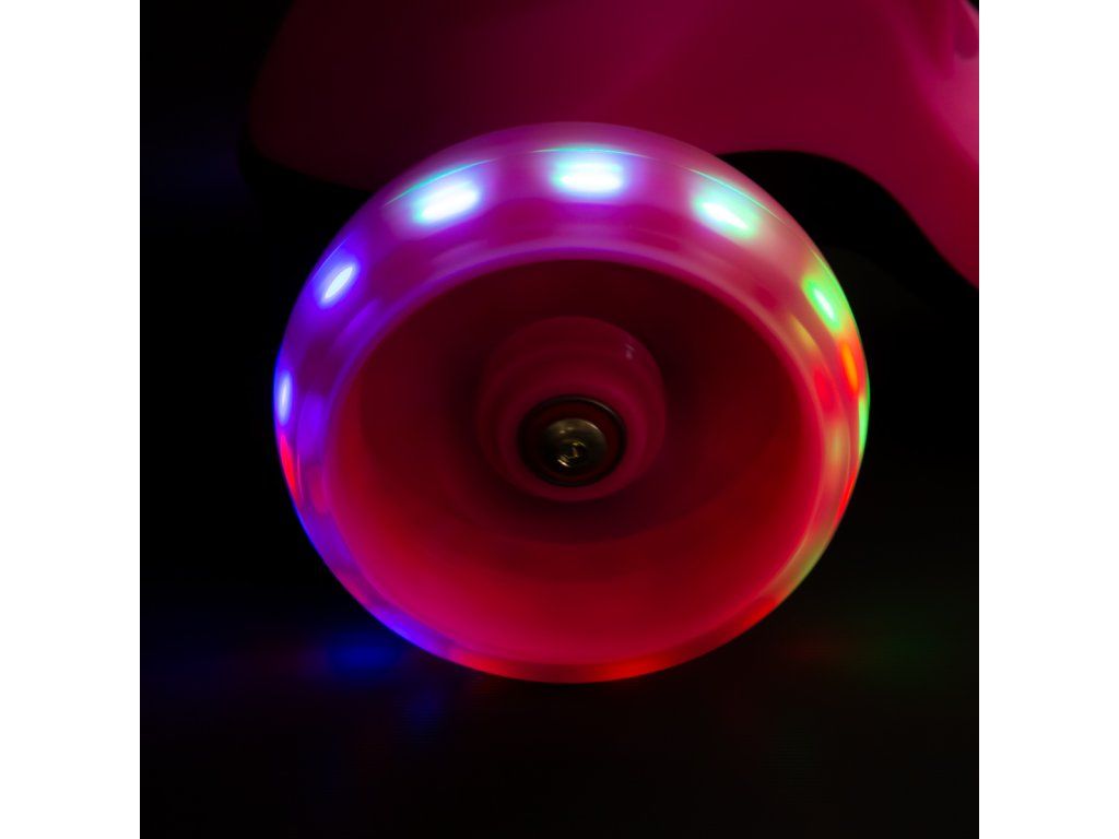 Všechny kolečka v sobě mají ukryty LED diody, které se při pohybu rozsvítí, široké zdaní kolečko zvyšuje stabilitu koloběžky. Řídítka je možné výškově nastavit v rozmezí 63 - 80 centimetrů.