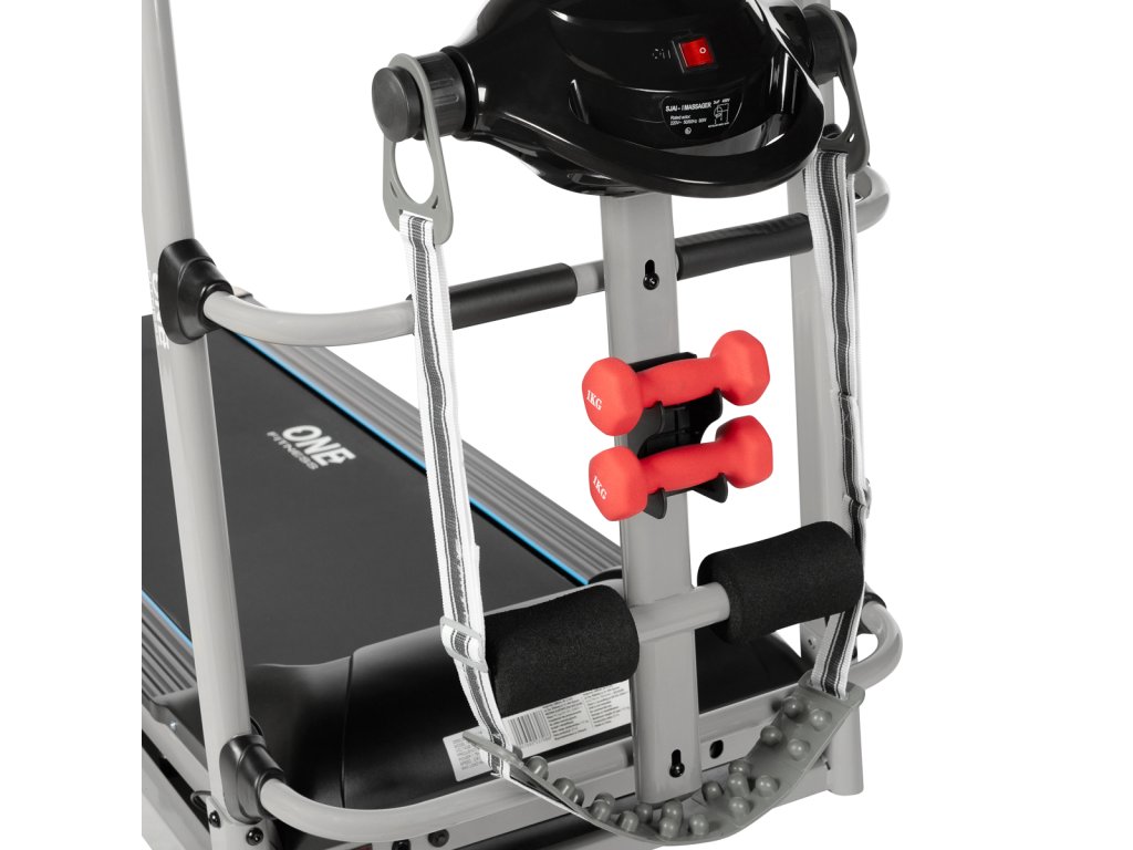 Součástí konstrukce je masážní hlavice pro připojení masážního pásu pro uvolnění zad a zarážky nohou pro cvičení sed-lehů. V balení dále nalezneme rotanu a 2 ks 1 kg činek.