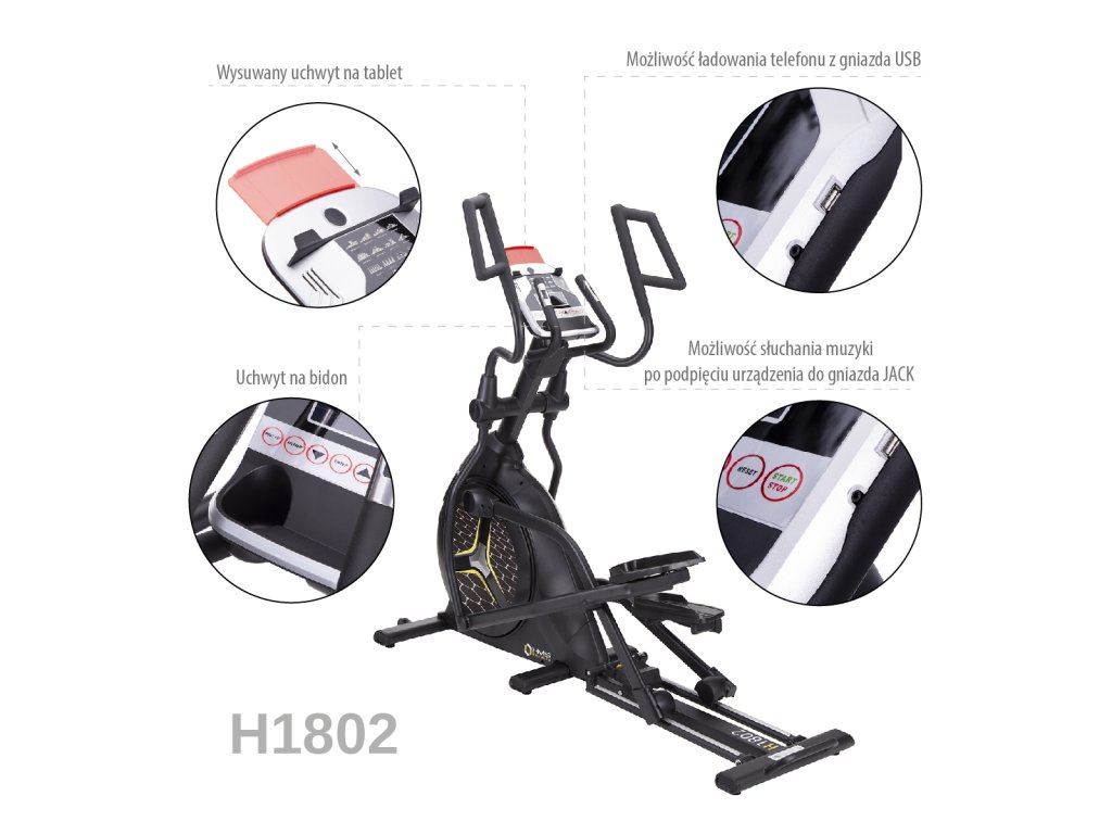 Robustní ocelová konstrukce garantuje nosnost až 150 kilogramů, přední stabilizátor je osazen transportními kolečky pro snadné přesouvání trenažéru. Šroubovací stopky umožňují vyrovnání trenažéru do roviny i na lehce nerovném podkladu. H1802 je také vybaven systémem pro změnu výšky kroku.