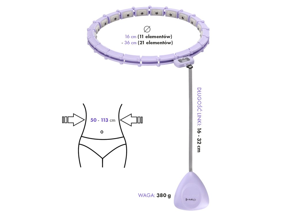 HMS HHM14 je hula hop obruč s nastavitelnou délkou, masážními magnetickými výstupky a rotujícím závažím.