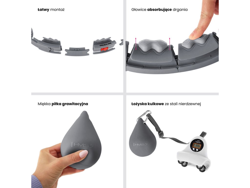 HMS HHW06 je hula hop obruč s nastavitelnou délkou, masážními výstupky, počítadlem a rotujícím závažím.