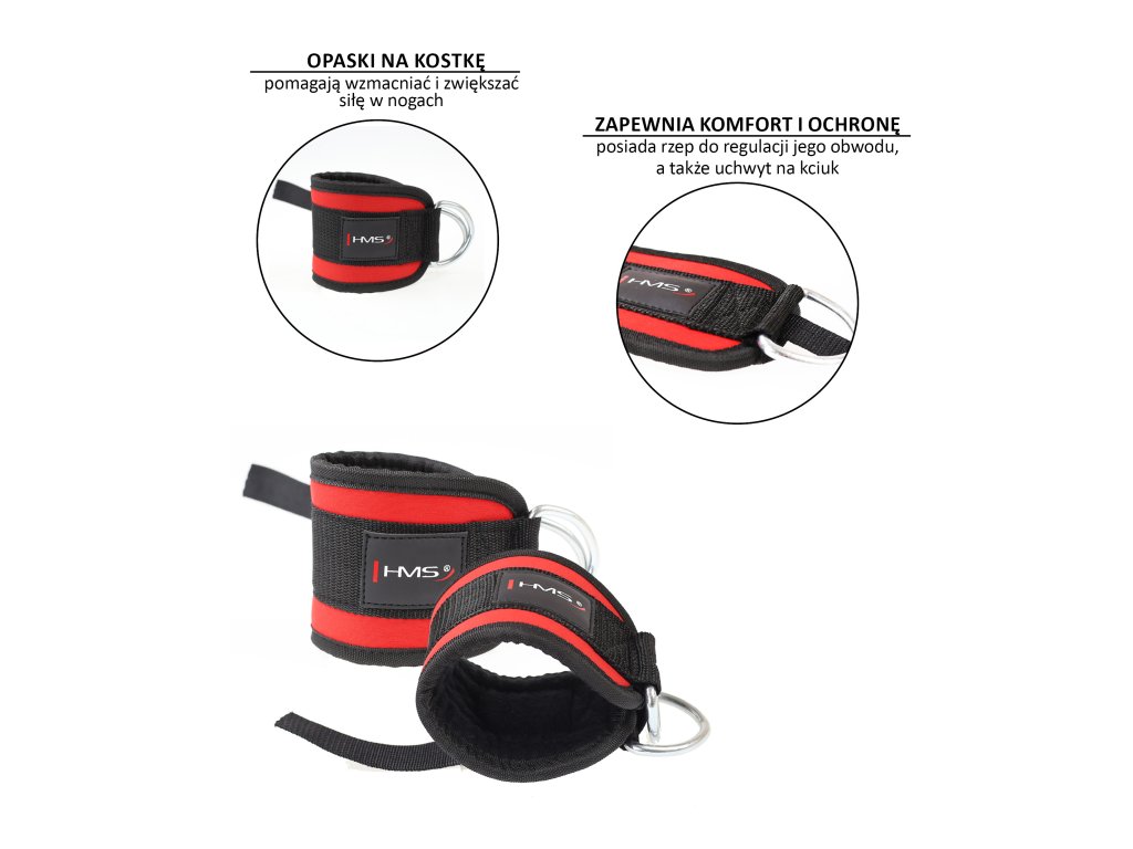 Popruh na kotník HMS je miniaturní cvičební pomůcka, vhodná k procvičení adduktorů, abduktorů, hamstringů a hýždí. Popruh se dá připevnit k posilovací věži a také k různým expandérům.