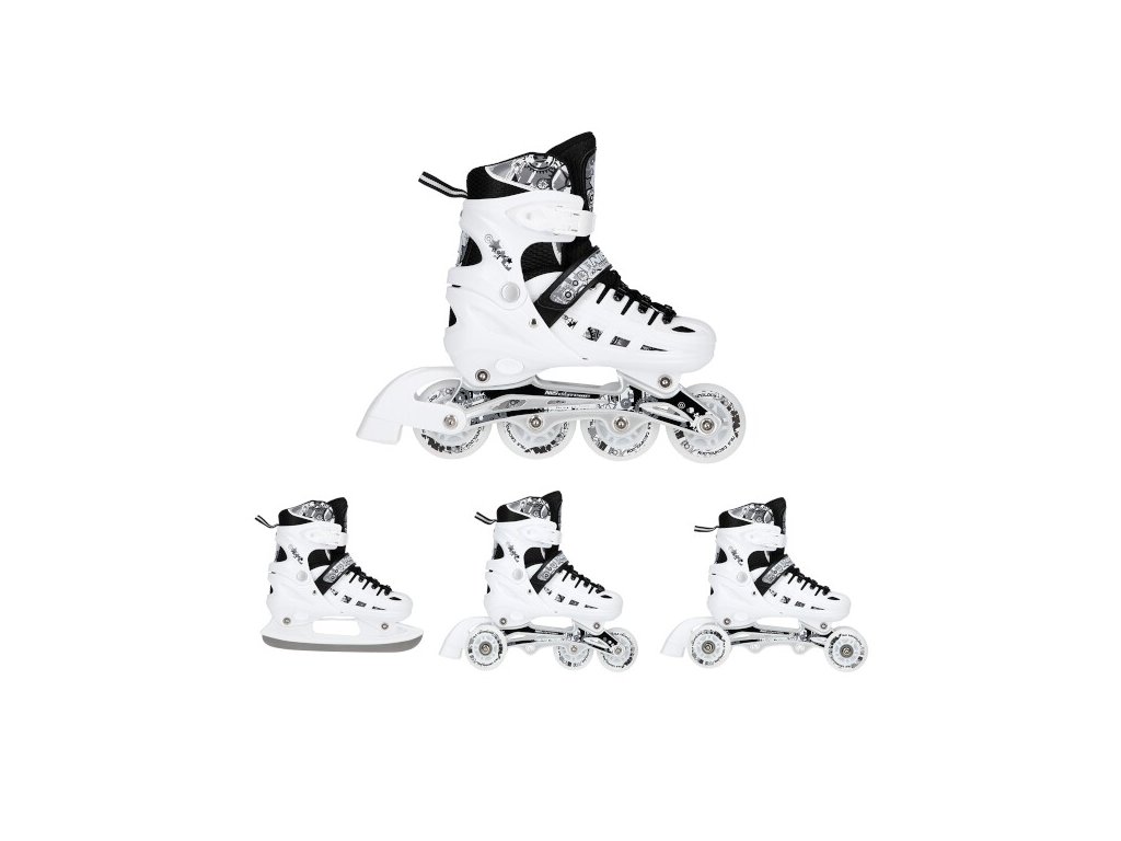 Brusle NILS Extreme NH10905 jsou multifunkční model, který nabízí hned 4 možnosti sestavení podvozku – jako brusle na led, in-line brusle, taneční (quad) brusle a pro nejmenší kombinaci 2+1+1 + nůž na led. Díky tomu jde o univerzální řešení, které se přizpůsobí věku i dovednostem uživatele a poskytne radost z jízdy po celý rok.
