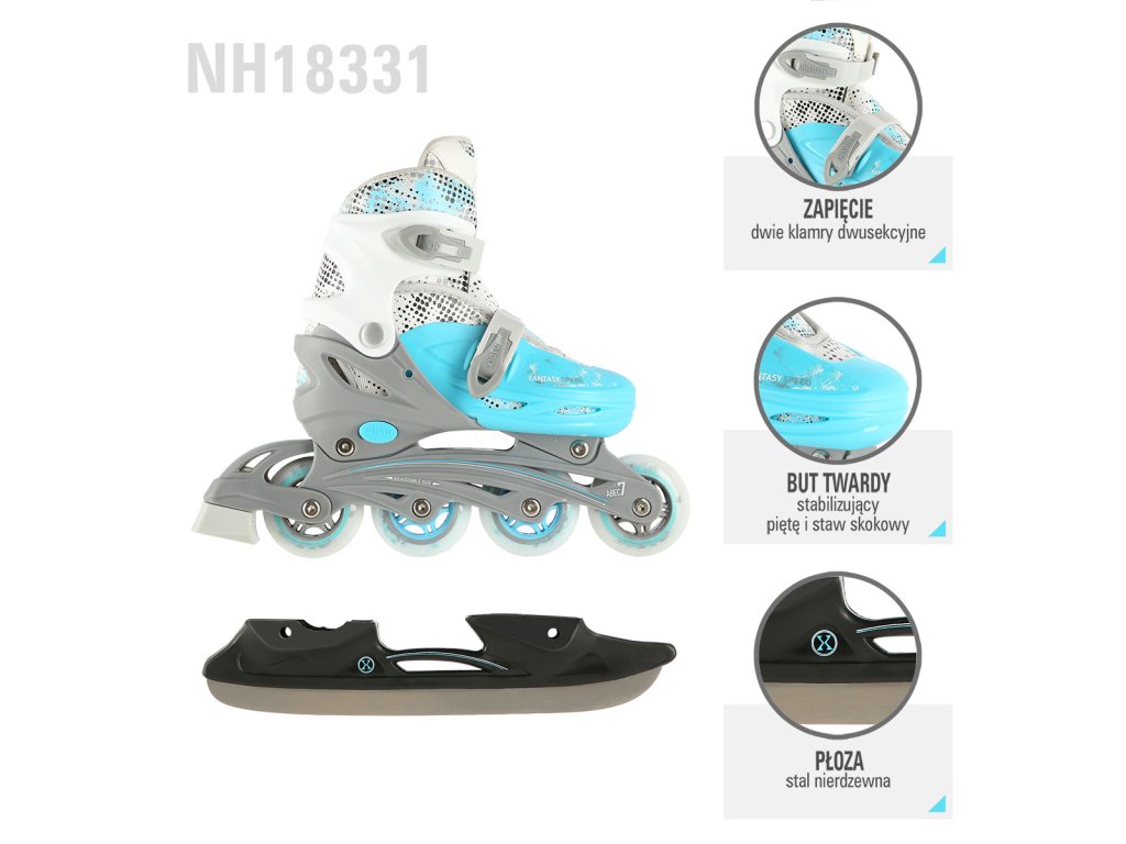 NILS Extreme NH18331 jsou kolečkové brusle 4v1 s variabilním podvozkem a s vyměnitelnými nožy na led, které jsou určeny pro začínající a středně pokročilé uživatele.